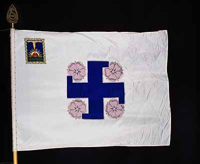 The Lotta Svärd emblem was designed by Eric Wasström in 1921. It includes the heraldic swastika and roses.
