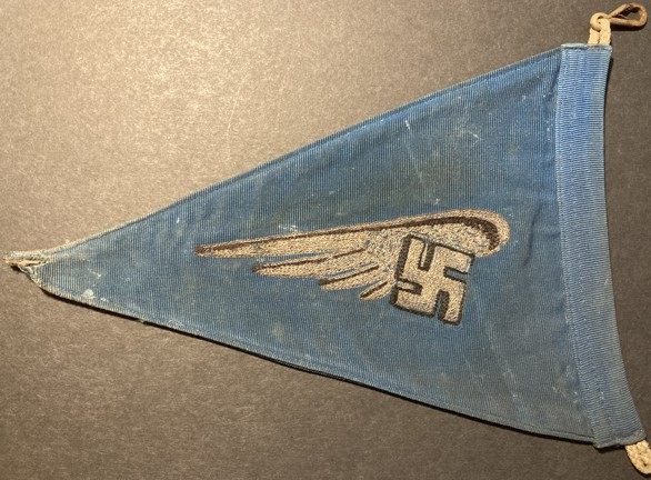 It is most similar to the "Car Pennant for Other Members of the Air Force", but instead of a flying eagle, has only a wing with the swastika superimposed. It is beautifully embroidered on both sides with the wing and swastika showing relief using different colours of thread. Any suggestions?