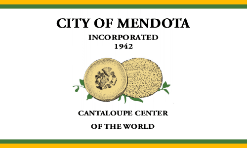 The flag is a white field with miniature bi-bars of gold and green on the top and bottom of the flag. The flag features cantaloupes in the center since Cantaloupe farming plays a big part in the Mendota's agricultural economy and in it's identity. The city's name and incorporation year are inscribed above the cantaloupe. Under the cantaloupe is the city's motto.