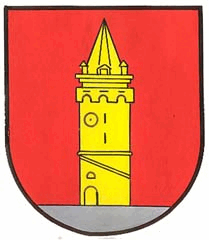 The coat of arms, granted since 1951, is dominated by the so-called "Türkenturm" (Turk Tower). The defensive tower, a remnant of the former town fortifications, was built in the first half of the 17th century, at the time of the Turkish sieges. It also symbolizes the market's jurisdiction (picture, source).