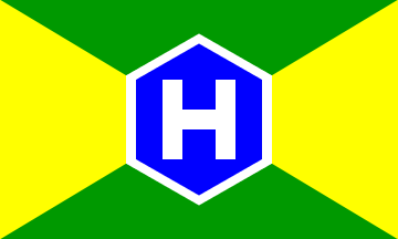 It is a yellow flag with celestial blue stripes at the top- and bottom-edge. In its centre is a red, capital "H".