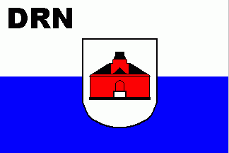 It is a horizontal white over blue bicolour. In its centre is the red silhouette of a crooked house. A newer flag shows the stylised local castle from the town arms in red and black and has a black inscriprtion "DRN" in canton