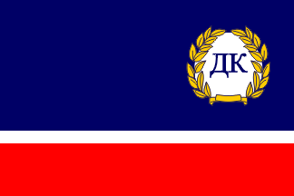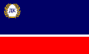 The flag of the Danube Commission is dark blue with a red stripe at bottom fimbriated white and with the emblem in the blue stripe next to the hoist. The emblem consists of a yellow wreath with a ribbon at the base encircling a white field containing the initials of the Commission.