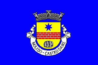 Shield Or a fess Gules masoned Argent, on chief a 7-point star Azure, on base a barrel Sable with hoops Argent. Mural crown Argent with three visible towers (village rank) and white scroll reading in black upper case serifed letters "MOLEDO - CASTRO DAIRE".