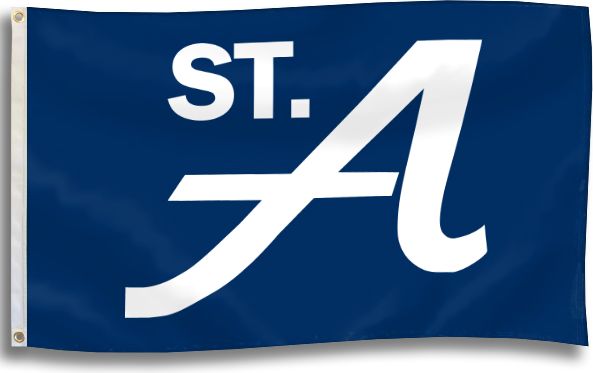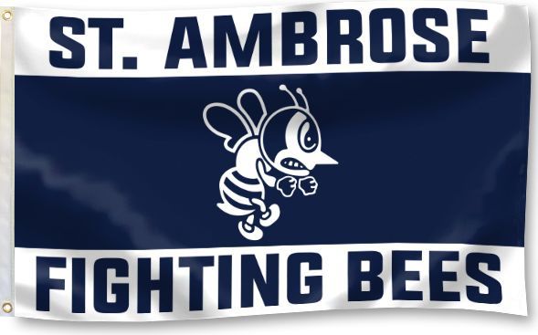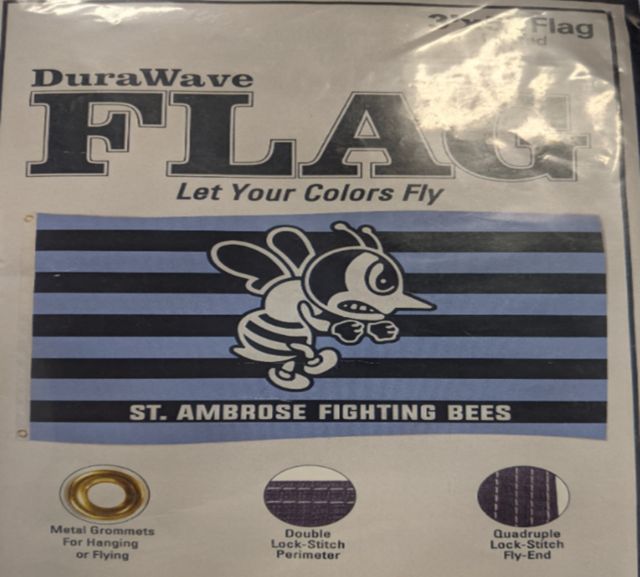 Official flag is white seal on blue. "St. Ambrose University" across the top,