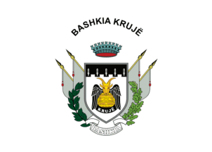 The flag of Krujë is white with the municipal coat of arms, above it "BASHKIA [Municipality] KRUJË" written in a semi-circular pattern.