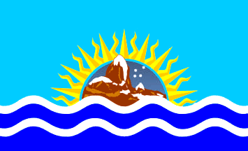 The coat of arms was adopted by Law No. 97 of September 25, 1959. The snowy mountain cap represent Mount Fitz Roy [or Chaltén], with the Constellation of the Southern Cross Constellation on the upper side of it, marking the southern latitude of the province. The full sun indicates the luminosity of the region.