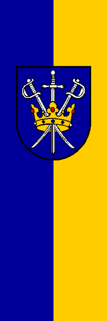 | Description of arms (German): | In Blau eine goldene Krone mit bunten Steinen, durchsteckt von einem silbernen, gestürzten Schwert und dahinter zwei silbernen, gestürzten, schräggekreuzten Degen. |