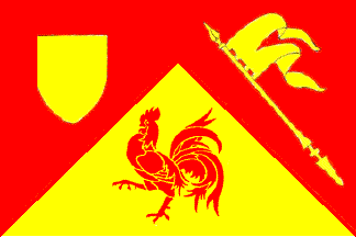 Flag: Bicolored, red and yellow. The red field is charged in the upper part with a shield at hoist and a swallow-tailed oriflamme at fly, all yellow. At the base of the flag appears the red "coq hardi", placed on a yellow triangle.