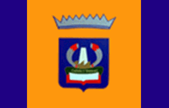 Divided per bend reduced, yellow over green, with the municipal shield in the centre in a white rectangle.