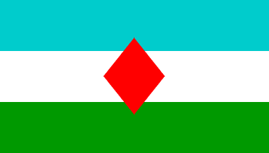 The flag is horizontally divided blue-white-green and charged with a red lozenge in its center.