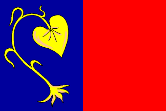 Description: vertically divided blue - red, and on the blue field a yellow plant, named "vykorenenym". Flag approved 27 Mar 2002.