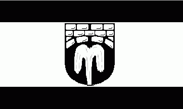 The flags ratio is 3:5. It is a black over white horizontal bicolour with a white rectangular flaghead. In the centre of the head is the coat of arms.