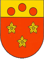 Gules three blossoms of medlar Or ordered 2:1, chief Or three torteaux ordered 1:2.