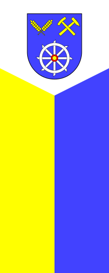 It is a yellow vertical monocolour parted by two connected trapeziums, blue from top and red from hoist. The coat of arms is slightly shifted to top.