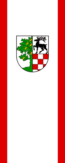 It is a red-white-red vertical triband with ratio of stripes approx. 1:10:1. The coat of is arms within the white stripe and shifted to the top.