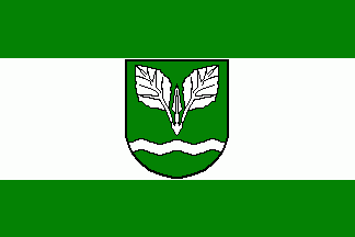 It is a green-white-green vertical triband with ratio of stripes approx. 3:7:3. The coat of arms is in the white stripe shifted to the top.