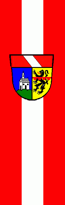 The shield is divided per pale into blue and gold (= yellow). The dexter side displays a silver (= white) church on top of a green triple mount. The sinister side displays a black, rampant lion tongued red and superimposed by a red label having four flaps. The red chief is divided in the centre by a silver (= white) bend.