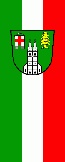 Shield Vert, issuant from base the western façade of a church Argent with two towers, flanked in chief at dexter by a gonfanon Argent parted by a cross Gules and at sinister by an eradicated fir Or.