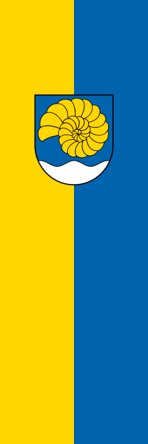 It is a yellow - blue vertical bicolour. The coat of arms is shifted to the top.