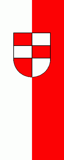 According to the Hauptsatzung it is a white-red vertical bicolour with coat of arms shifted towards the top (see left image at top of page) but in use is a banner quartered of white and red with centred coat of arms (see right image at top of page).