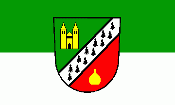 Shield parted by a bend sinister Argent, charged with 12 firs, above right Vert the western façade of a church Or having two towers, beneath left Gules a glass plunger Or.