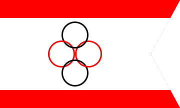 and a device on the white area consisting of four interlocking rings, two red ones horizontally and two black ones vertically, shifted to hoist.