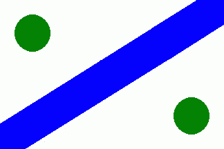 Flag: Rectangular flag in proportions 2:3, made of a white panel crossed by a diagonal blue stripe running from the hoist's lower angle to the fly's upper angle and charged with two green disks in vertices.