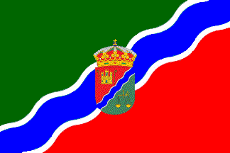 Coat of arms: Tierced per bend sinister, 1. Gules (red) a castle or port and windows azure surrounded by two staffs or, 2. A bend wavy azure fimbriated argent, 3. Vert (green) a pair of scales or surmounted by a sword argent crossing the left arm of the scales. The shield surmounted with a Royal Spanish crown.