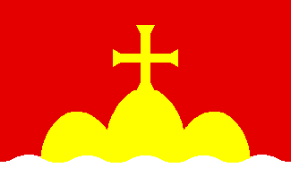 Flag: The flag shall be a transposition of the elements of the municipal coat of arms on a rectangular, red panel. The elements shall be placed orthogonally to the horizontal display of the flag and cover the maximum height.