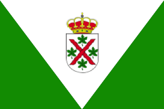 Flag: Rectangular flag, in proportions 2:3. Composed of a green panel with a white triangle with points in the flag's upper angles and in the center of the flag's lower edge. Charged with the municipal coat of arms.