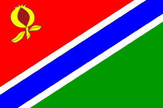 Flag: Rectangular flag, in proportions 2:3, made of a blue ascending diagonal stripe bordered white, a red triangle along the hoist charged with a yellow pomegranate and a green triangle along the fly.