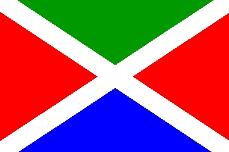 Flag: Rectangular, in proportions 2:3. Quartered per saltire. The triangles at hoist and fly, red, the upper triangle, green, the lower triangle, blue. All over a white saltire, in width 1/7 of the flag's width.