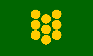 Flag: Rectangular, in proportions 11 x 18, green, charged at 2/3 of its width with nine yellow disks placed in three pallets of three each, the central one lower.