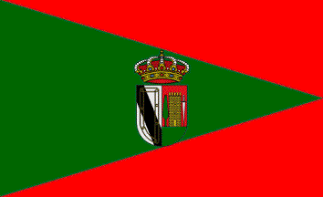 Flag: Rectangular, in proportions 11 x 18, blood red with a grass green triangle placed along the hoist and reaching the fly's midpoint. Charged in the center with the coat of arms of the place..