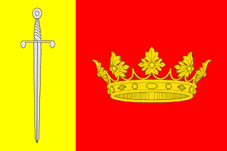 Flag: In proportions 2:3, tierced at hoist [1:2). On the fly, red (or, gules), a Duke's coronet or (or, yellow). Tierced at hoist or (or, yellow), a sword argent (or, white).