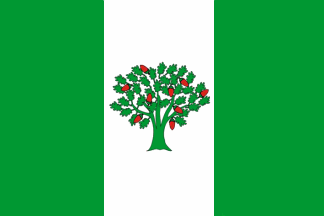 Pano de verde cunha franxa vertical de branco no terzo do centro e, nesta, un carballo de verde follado e froitado de nove landras de vermello.