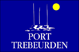 The flag of Port Trébeurden is made of the logo of the marina, which depicts on a blue background the white silhouettes of three ships, without sails, on waves, lit by a yellow sun in the upper horizon. The name of the marina is written on two lines beneath the emblem, in white letters.