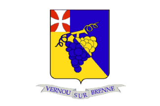 The flag of Vernou-sur-Brenne (photo, photo, photo; design confirmed by the muncipal administration, 22 December 2020) is white with the municipal arms, "Per bend azure and or a bunch of grapes of two tendrils counterchanged a canton gules a cross patty argent", below it a ribbon with the name of the municipality.