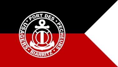 As observed by Dominique Cureau (see Vexillologie provençale website), the colours of Biarritz can still be observed too on the flag of the Association of users of the “Port des pêcheurs” (fishermen’s port) of Biarritz. The flag is black over red, swallow-tailed, with the emblem of the association in white.