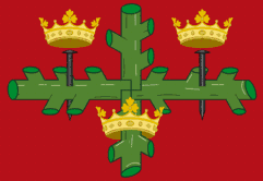 Blazon: "Gules a cross raguly, couped proper, the arms joined in fylfot, between two ducal coronets in chief or the bottom part of the cross enfiled with a ducal coronet of the last, beneath each coronet a nail of the first, that in base piercing the cross."