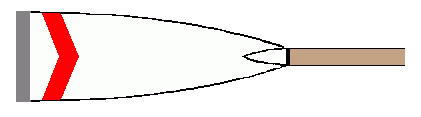 Blade is white with a red chevron pointing to loom, simplification of the chevron engrailed from the college arms.
