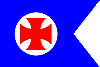 swallow-tailed, blue with a red cross patty inscribed in a white disc.