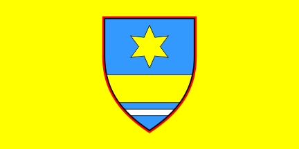 The flag (photo, photo) is in proportions 1:2, yellow with the coat of arms, bordered red, in the middle. The height of the shield is 3/4 of the flag's width. The size of the red border is 1:86 (of the flag width?).