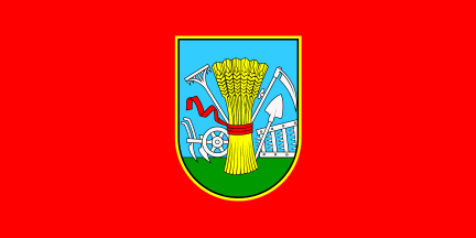 The flag is in proportions 1:2, red with the coat of arms, bordered yellow, in the middle.
