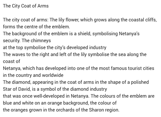 The colours of the emblem are blue and white. The background colour to the city emblem and flag is orange, the color of the oranges growing in the Sharon region citrus plants.