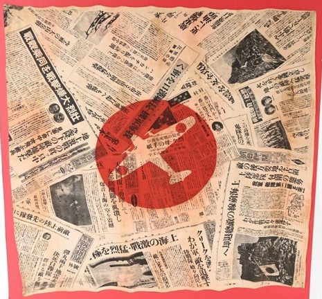 Caption: WWII Japanese flag brought back by Ralph Belfiglio 473171 of Co. B, 1st Battalion 2nd Marine Division. The flag measures 28 X 27 inches with Japanese Newspaper articles printed over top of it talking of Victories of the Imperial Japanese Army and Navy.