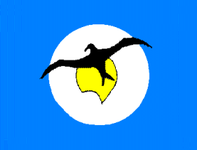 The second flag for Ocean Island I know of is a field of medium blue, with a white central disc. Inside the white disc is a central emblem coloured gold, of a stylized silhouette map of Ocean Island itself. Laid over this and extending over the circle is a black frigate bird in flight.