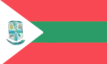 Horizontally divided red-green-red with a white triangle extending from the hoist, bearing the arms.