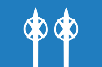 Blazon: I blått to oppvoksende sølv skistaver. In English: Azure two